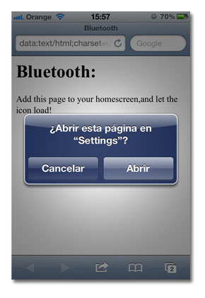 Lo único que debemos hacer es entrar en la web desde nuestro dispositivo móvil y en la parte inferior de la Web tenemos los habituales accesos a ajustes, para que elijamos el que necesitemos. Cuando lo hayamos seleccionado, nos aparece una ventana de si queremos Abrir esta página en “Settings”, a la cual decimos que no.