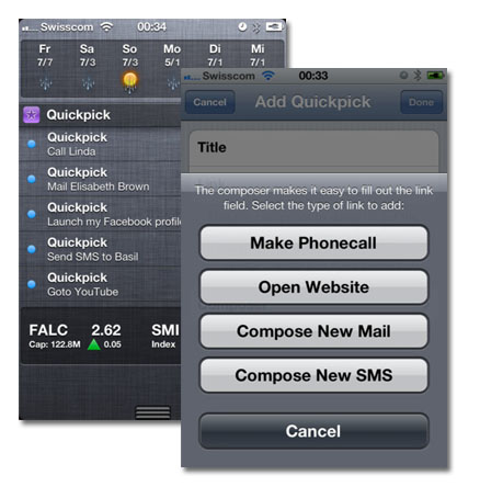 Quickpick nos pide el nombre identificativo y el link, que por ejemplo, si escribimos «fb://profile», nos abre nuestro perfil Facebook. O «youtube://» para abrir Youtube, «maps://», «sms://»… soporta varias de las aplicaciones propias de iOS o instaladas por nosotros como las redes sociales.