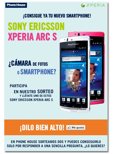 Si aún no eres seguidor de Phone House en Facebook, únete estas navidades y participa en el sorteo de dos smartphone Sony Ericsson Xperia Arc S libre en blanco o rosa. Lo único que debes hacer es acceder a nuestro muro de Facebook y clicar sobre el “Concurso Xperia Arc S”, para responder una sencilla pregunta.