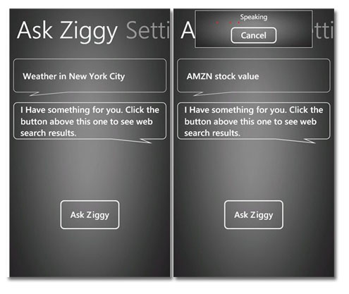 El propio sistema Windows Phone ya tiene ayuda por voz para por ejemplo los SMS y realizar llamadas, pero Ask Ziggy te permite acceder por voz a la información del tiempo o hacer cáculos. Su diseño es similar a Siri y está desarrollado bajo la tecnología Nuance, la misma que usa Apple cuando compró esta compañía.