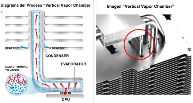 La diferencia sobre las Heat Pipes sobredimensionando la zona de cambio de fase, se consigue con un líquido que permuta de fase en el intercambiador de calor transformándose en vapor y condensándose en el radiador del disipador.
