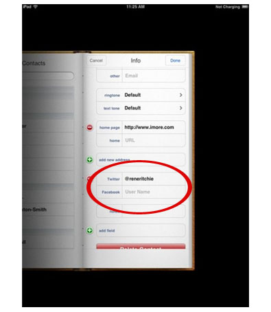 La Beta 3 de iOS 5.1 esperemos que se convierta en una realidad con esta opción de Facebook, porque cuando se lanzó iOS 5 con Twitter asociado, todos hemos echado en falta esta otra red social mundialmente conocida. Han encontrado esta evidencia al entrar en la opción de los contactos y comprobar que a parte de pedir el usuario Twitter como ocurre ahora, también nos ofrece el usuario Facebook.