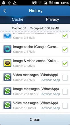 - Caché residual y temporales de aplicaciones: tras instalar aplicaciones y posteriormente desinstalarlas (si no nos han gustado) siempre quedan restos que indican que la aplicación ha estado allí, como por ejemplo los juegos. Clean Master se encarga de buscar esos datos y poder borrarlos de la memoria.