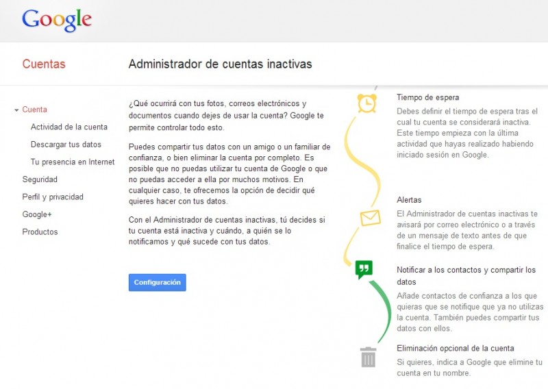 Como suena. Google ha lanzado un servicio que pretende terminar con el problema de la gestión de los datos o contenidos digitales de un usuario tras su fallecimiento. Los propietarios de las cuentas de Google podrán decidir si desean que sus datos sean borrados tras un periodo de tiempo establecido, o si por el contrario prefieren que sean transferidos a otro usuario. Esta nueva función se denomina administrador de cuentas inactivas.