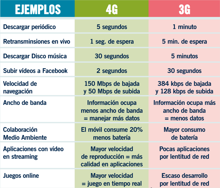 Las ventajas de la 4G son impresionantes, la velocidad de internet se incrementa tanto que la descarga de un periódico se puede hacer en 5 segundos mientras que con 3G tardaría cerca de 1 minuto. Os dejo una foto con una tabla comparativa para que vosotros mismos juzguéis.