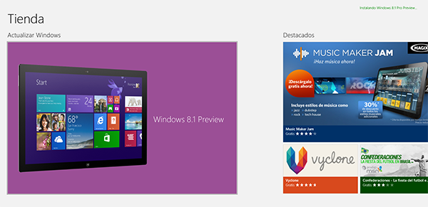 Una vez que tengas descargado el archivo de actualización deberás instalarlo aceptando los términos y condiciones. Una vez instalado, abre la aplicación de tienda y te aparecerá en la primera página la actualización de Windows a 8.1 preview.