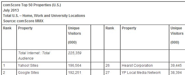 Las páginas web de Yahoo! superaron en visitantes únicos al resto de portales de internet el pasado mes de julio en EE.UU., adelantando en el ranking al que ha sido líder durante los últimos 5 años: Google. Yahoo!, a la que pertenecen Flickr y Tumblr entre otras, ha acumulado entre el 1 y el 31 de julio un total de 196.000 millones de visitas únicas. En segundo lugar se encuentra Google, a la que pertenece Youtube, con 192.000 millones. En tercer lugar se sitúa Microsoft, con 185.000 millones de visitas únicas.
