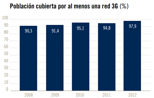 También desdela CMT han determinado la evolución de la cobertura 3G en España, la cual ha pasado de un 90,3% en el2008, a un 94,8% en 2011 y un 97,9% en 2012.