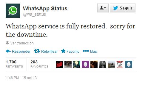Los usuarios de la aplicación utilizaron las redes sociales, principalmente Twitter y Facebook, para notificar estos inconvenientes, y confirmar que se trataba de un fallo general. De hecho, es en Twitter, en la cuenta oficial llamada @wa_status donde la compañía se ha disculpado por el tiempo de caída de servicio, justo después de anunciar que ya lo habían restablecido.