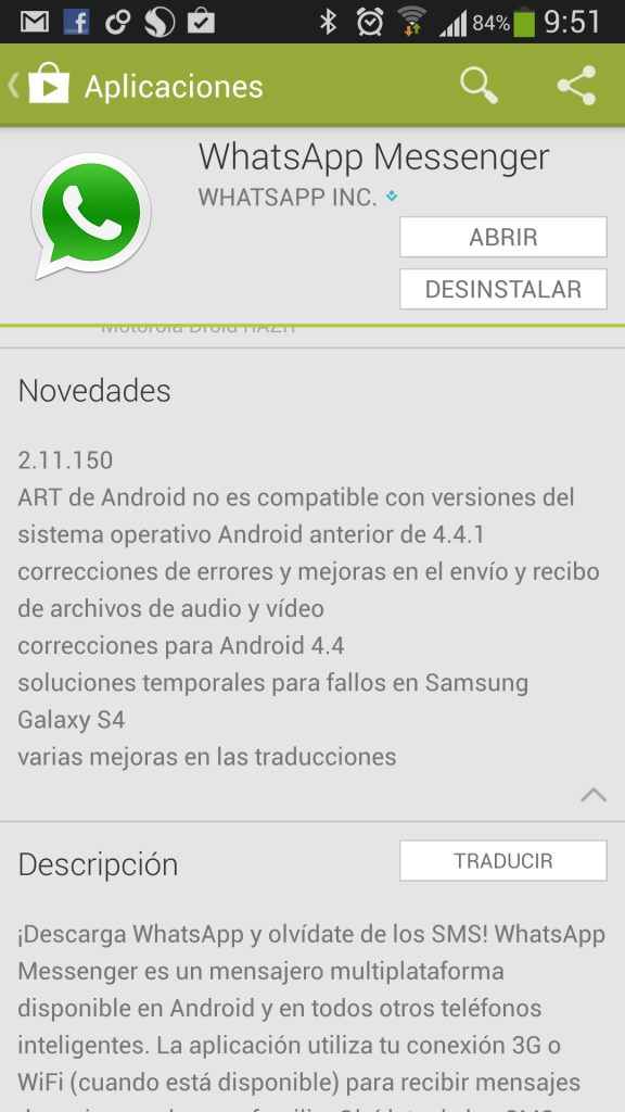 Llega la versión 2.11.150 de Whatsapp que se empezó a distribuir ayer y que además de reparar pequeños errores como los que se tenían con el S4 en el envío de audio y vídeo, en algunas traducciones, en resumen, en los dispositivos que estaban recibiendo la actualización 4.4 Kit Kat del sistema operativo de Google.