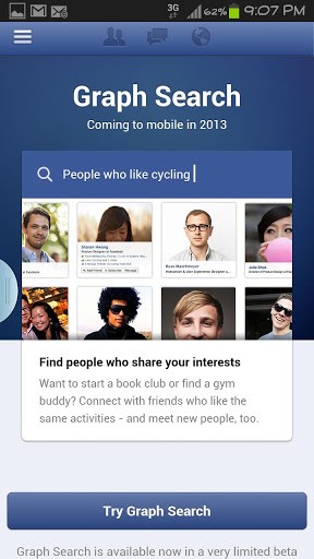 Aunque en un principio parecía que dicho nuevo buscador sería para la versión web, al parecer este método de búsqueda está llegando a los dispositivos móviles. No a todos los usuarios por el momento, pero sÍ a muchos usuarios en modo de prueba de forma que cuando acceden, les aparece el nuevo buscador con la bienvenida a Graph Search.
