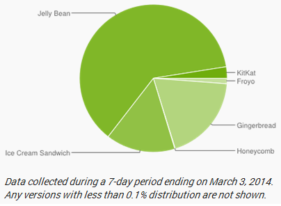La compañía Google, propietaria de Android, ha actualizado su web “versiones de plataforma”, donde aparece la cuota de adopción de cada versión de Android, en la que su última versión conocida como KitKat cuenta ya con un 2’5%.