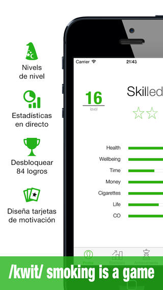 ¿Cómo puede ayudarte una aplicación a dejar de fumar? Kwit utiliza técnicas, razonamientos y mecánicas basadas en juegos para animar a las personas en su afán por dejar de fumar. Según vayas completando esos juegos, irás alcanzando niveles y puntuaciones hasta convertirte en el Kwitter Supremo.