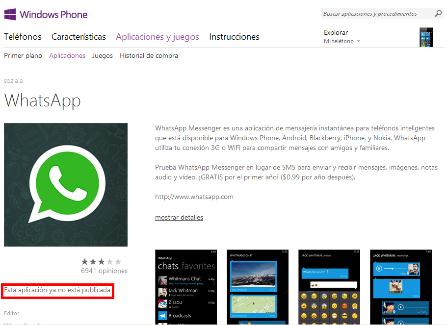 Los que ya tuvieran instalada su aplicación en su terminal con Windows Phone, podrán seguir utilizándola igual que hasta ahora, el problema es para los nuevos usuarios, que ya no podrán descargarla desde Market Place.