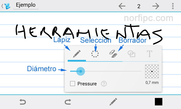 En cuanto a los tipos de escritura, tenemos de todo prácticamente: podemos elegir el grosor del trazo, el color, si queremos escribir como un bolígrafo o como un rotulador (opción solo para la versión Pro) e incluso podemos activar la presión en pantalla de forma que cuando se detecta una mayor presión sobre la pantalla se marca más lo que escribimos.