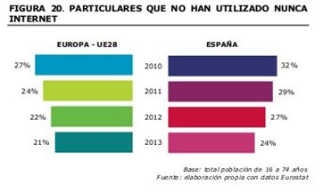 En relación con Europa, un 24% de los españoles declara que nunca ha utilizado Internet, frente a la media del 21% de los europeos. Otro dato reseñable es que “sólo” un 32% de los españoles hace compras por Internet, mientras que en Europa esta misma cifra se sitúa en el 47%.